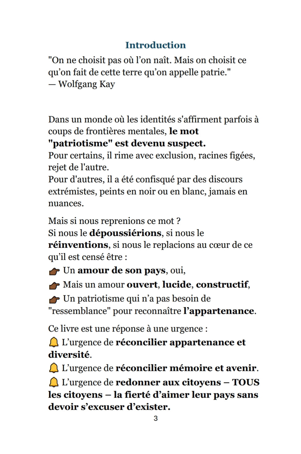 Ce livre est écrit par un patriote noir, français jusqu’à la moelle, qui en a assez qu’on dise qu’aimer son pays serait réservé à une couleur, une origine ou une histoire particulière.